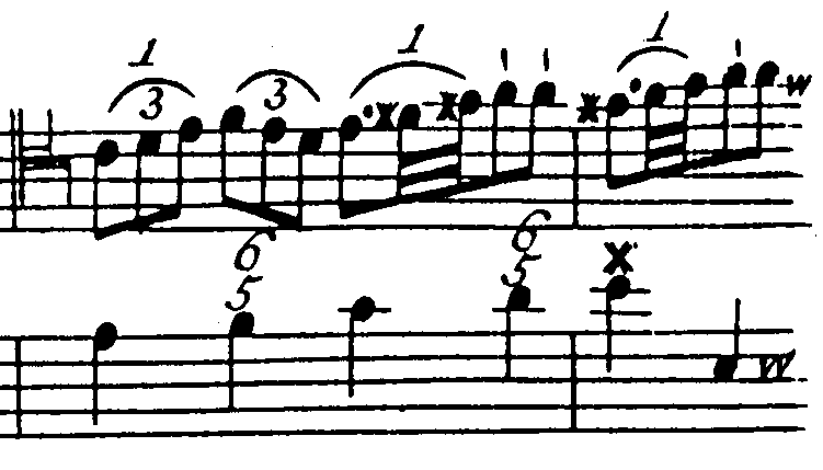 J.H. Klein Opus 4 pg. 25: Sonate 5 deel 1 (Poco Allegro) maat 8v en 9vv.Alternatief zonder portamento: 124 431 124 22; 123 22 123 22; (...) ; (...) ; 14 30 (...); (...).