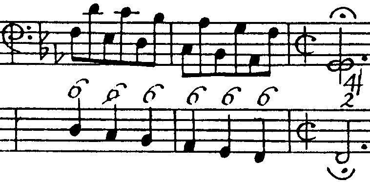 J.H. Klein Opus 4 pg. 34: Sonate 6 deel 2 (Adagio) maat 10v.Een ander fenomeen dat aandacht vraagt is het veelvuldig gebruik van Unisono in Kleins Sonates Opus 4. Het doel hiervan is soms puur om de stemvoering in meerstemmige passages duidelijk te maken, soms om (ook in duimpositie!) een mildere overgang te bereiken tussen de a- en de d-snaar van de cello en soms om een volumineus, ruig klankeffect te bereiken door een losse G-snaar met een gestopte C-snaar te combineren. Enkele voorbeelden ter illustratie: