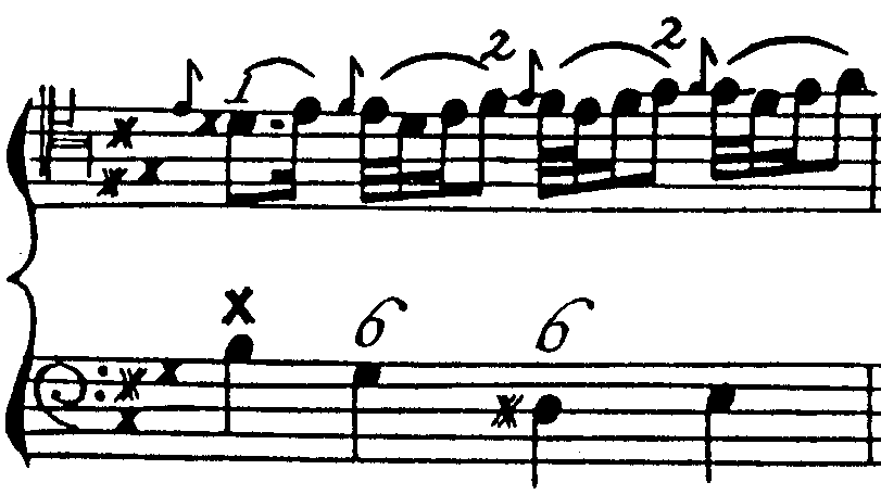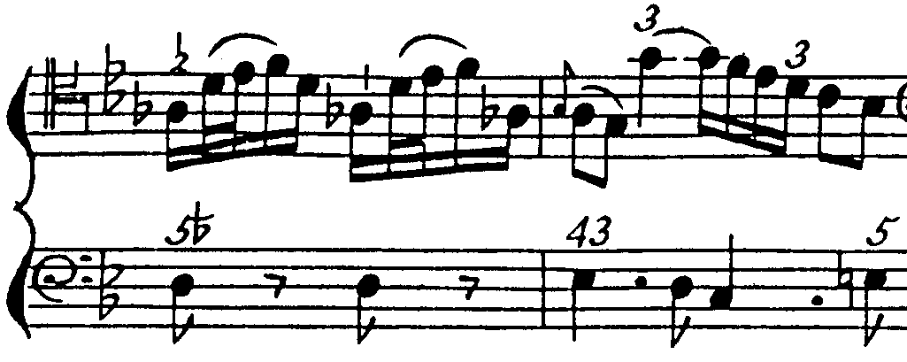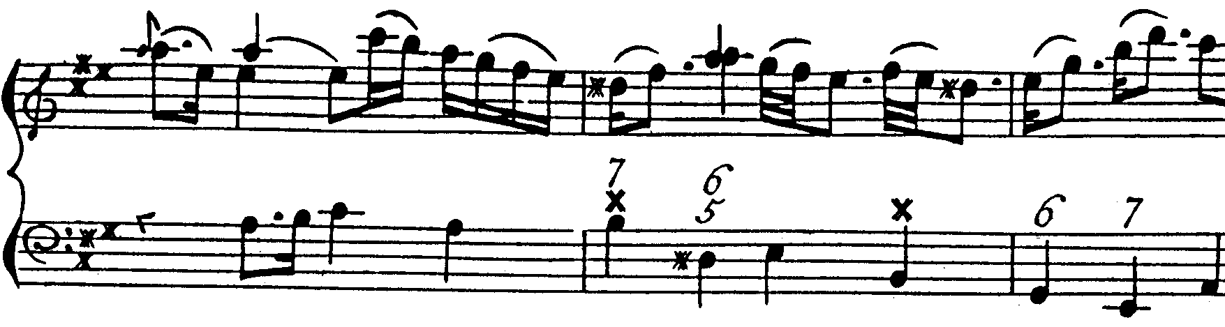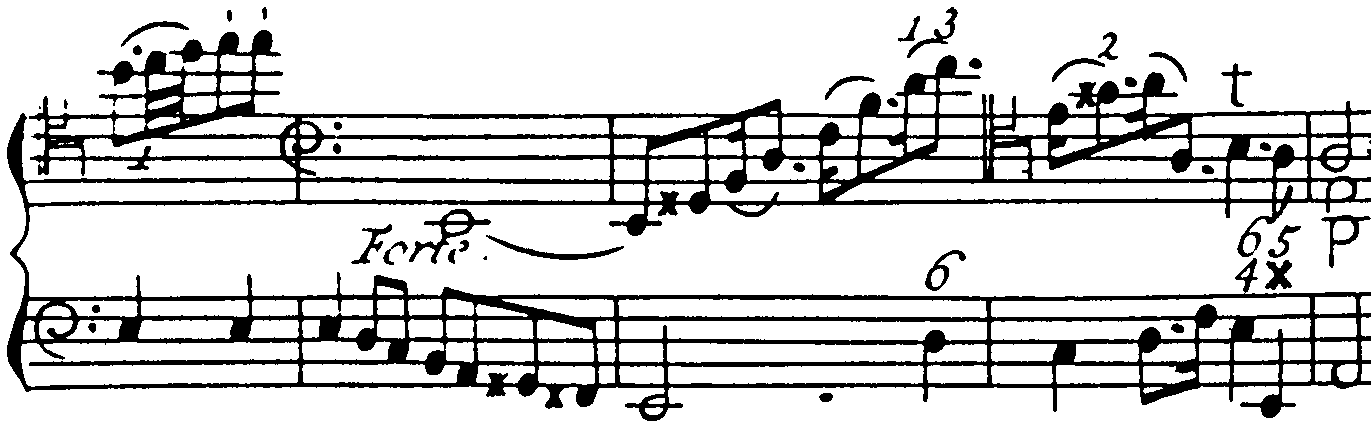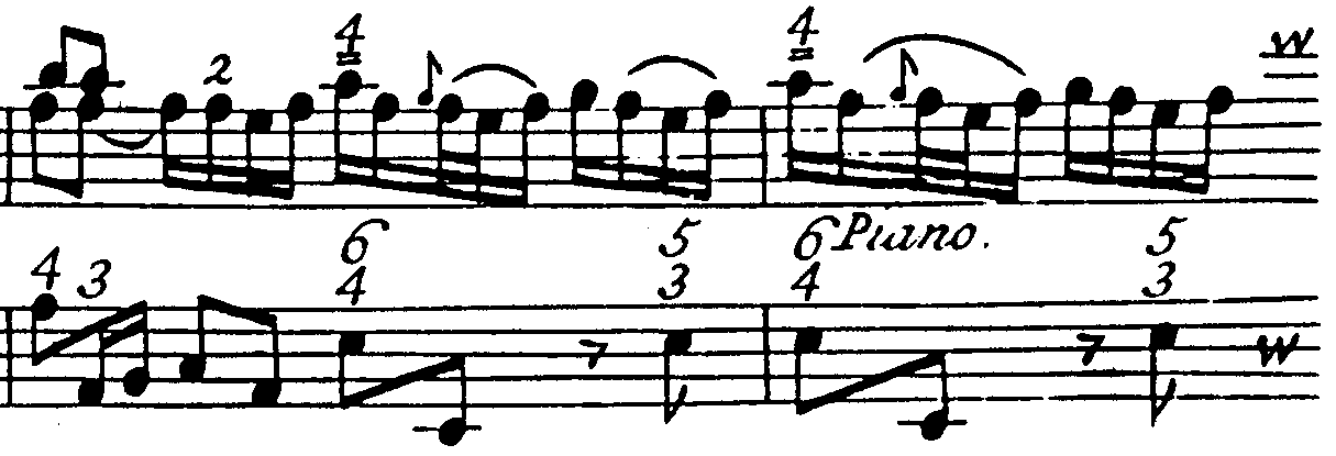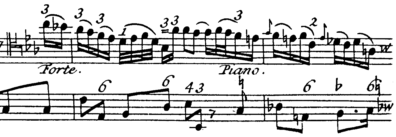 J.H. Klein Opus 4 pg. 33: Sonate 6 deel 1 (Allegro-Vivace-Allegro) maat 93vv.Klankkleur grommende bas (let ook op het secunde-accoord).