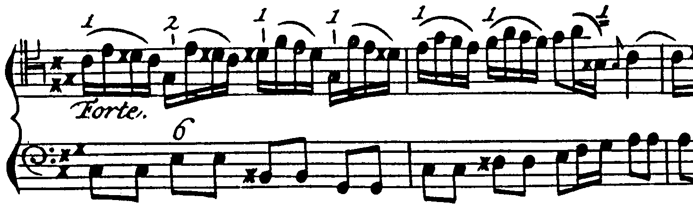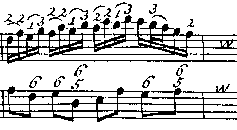 J.H. Klein Opus 4 pg. 25: Sonate 5 deel 1 (Poco Allegro) maat 8v en 9vv.Alternatief zonder portamento: 124 431 124 22; 123 22 123 22; (...) ; (...) ; 14 30 (...); (...).