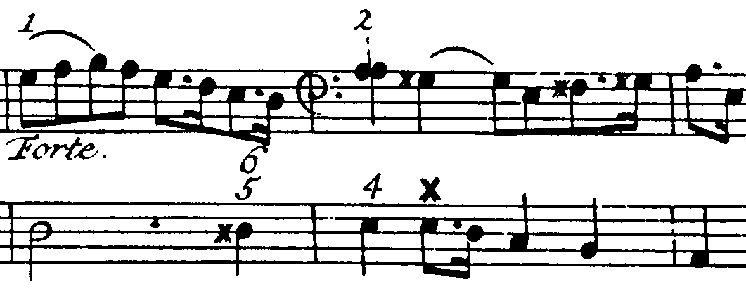 J.H. Klein Opus 4 pg. 22: Sonate 4 deel 2 (Largo) maat 15vv.Het tegendeel gebeurt echter op verschillende momenten, waar lyrisch gezien een portamento op zijn plaats is. Daar wordt tijdens een legatoboog van positie gewisseld: